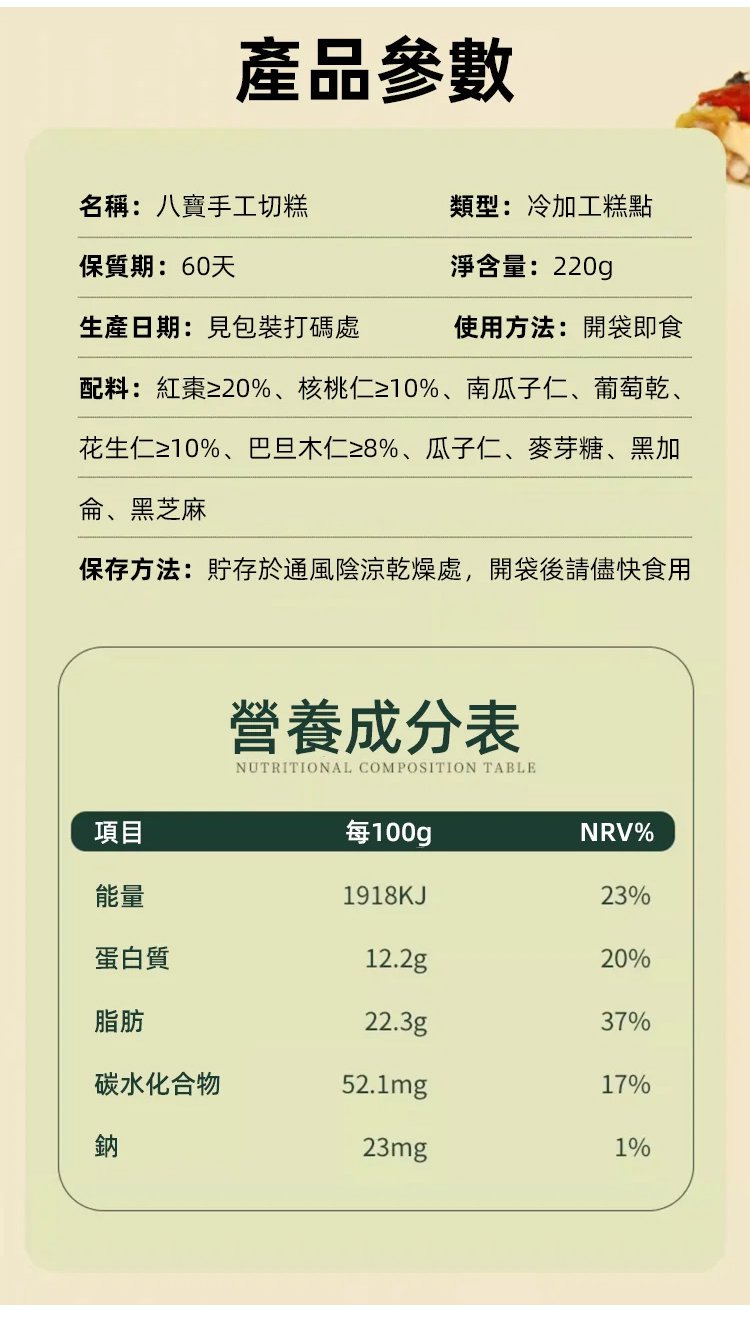 11分鐘前【*國際美食2星獎*養生食品首選!老師傅正宗手作切糕,純天然八寶堅果+五穀粗糧,無蔗糖無添加,飽腹代餐,營養均衡,老幼孕放心吃】傳統老式手工糕點,0添加蔗糖更健康 純手工製作手工堅果切糕 营养健康,家里有老人小孩的必须准备的零食坚果! - 【1袋/220g】嘗鮮,僅需799