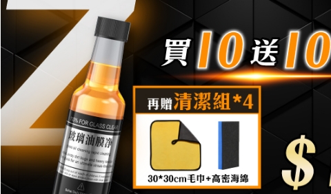 11分鐘前視線不清晰/行車不安全/一罐輕鬆去油膜 油膜玻璃淨 /水珠自然滑下不殘留/倒入玻璃水箱/立刻見效 - 【一罐79元】買10送10 / 贈清潔品*4NT$1580